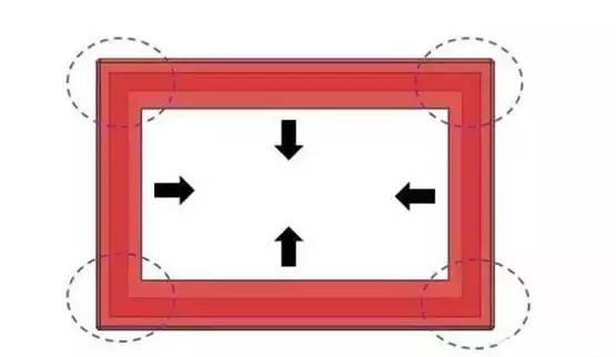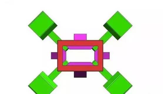 碰到此類產品,我們首先會考慮能不能做斜頂,但通過分析,做斜頂4個角落位置的倒扣無法脫離(箭頭方向做斜頂)