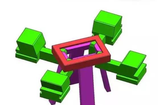 斜頂無法完全脫倒扣,我們只能考慮能否用斜頂+內滑塊的方式進行設計。如下圖所示,綠色部件為內滑塊,粉紅色部件為斜頂。