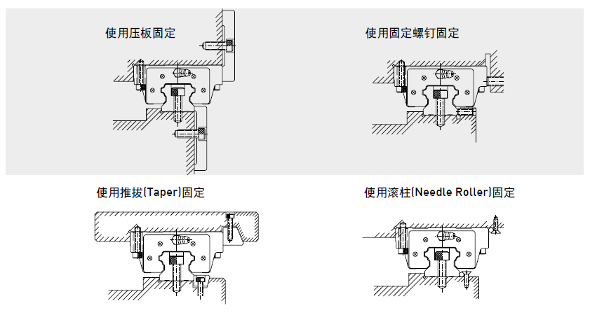 當(dāng)床臺(tái)受到振動(dòng)、沖擊力的作用時(shí),導(dǎo)軌及滑塊很可能偏離原來(lái)的固定位置,而影響精度。為避免發(fā)生類(lèi)似的狀況,建議使用下圖所列的四種固定方式固定導(dǎo)軌及滑塊,以確保機(jī)臺(tái)的運(yùn)行精度。