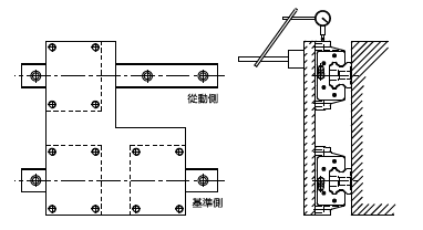在無固定螺釘?shù)陌惭b例中為確保從動側(cè)導(dǎo)軌與基準(zhǔn)側(cè)導(dǎo)軌間的平行度,導(dǎo)軌可依下列所示安裝,而滑塊的安裝則與前述范例相同。