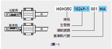 2. 確認(rèn)基準(zhǔn)軌與從動(dòng)軌:當(dāng)非互換型直線導(dǎo)軌配對(duì)使用時(shí),需注意基準(zhǔn)軌與從動(dòng)軌之差異?;鶞?zhǔn)軌側(cè)邊基準(zhǔn)面精度較從動(dòng)軌高,可作為床臺(tái)安裝承靠面?;鶞?zhǔn)軌上有刻上MA之記號(hào)。而且,雙軌配對(duì)使用時(shí),基準(zhǔn)軌編號(hào)為奇數(shù),而從動(dòng)軌之導(dǎo)軌編號(hào)為偶數(shù),安裝時(shí)請(qǐng)依照符號(hào)的指示,按順序進(jìn)行安裝(例如:001與002配對(duì)、003與004配對(duì)…),如圖一所示。如為多軌安裝,請(qǐng)以此類推。