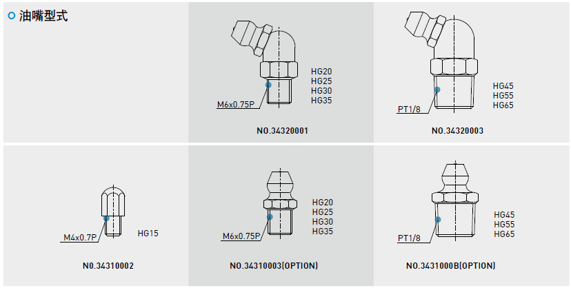 依客戶需要在滑塊前端或后端裝上油嘴以供手動打油,HG系列特別在端蓋側邊預留側油孔位置安裝油嘴(一般為直油嘴),提供側向打油,側向打油的位置建議在非側基準邊,但若有特殊需要亦可放在側基準邊。客戶如有上述側向打油需求請與我們聯(lián)絡。使用接管方式自動供潤滑油脂之直線導軌,則可依連接管型式選用安裝油管接頭。