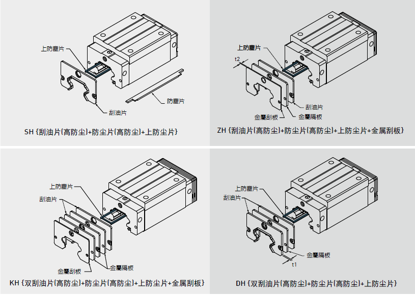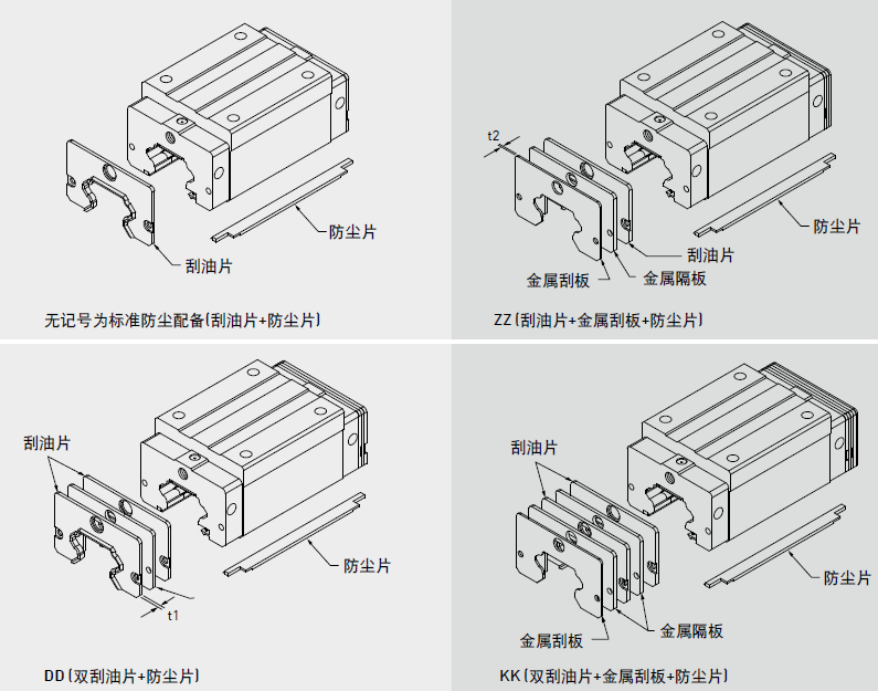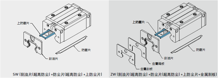 HIWIN特別針對(duì)具有粉塵顆粒之嚴(yán)苛作業(yè)環(huán)境,如木工機(jī)械、玻璃/石墨加工等設(shè)備,開發(fā)具有超高防塵功能之特殊配件,實(shí)現(xiàn)超高防塵性能。若有下列高防塵配件需求時(shí),請(qǐng)于產(chǎn)品型號(hào)后面加注代碼。