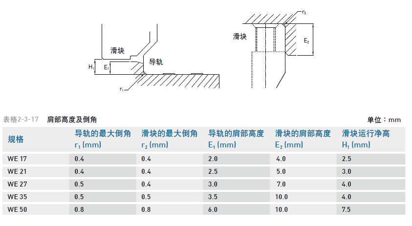安裝直線導(dǎo)軌時必須注意安裝面肩部的狀況是否適當,如倒角過大,凸出的地方易造成直線導(dǎo)軌精度不良,而高度過高則會干涉滑塊。故如果能依照建議要求安裝面肩部,安裝精度不良即可排除。