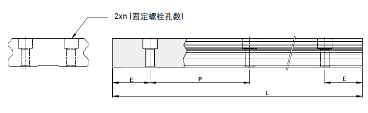 HIWIN 備有導(dǎo)軌標準長度庫存供應(yīng)客戶需求。若客戶訂購非標準長度導(dǎo)軌時,端面距離E的尺寸最好不要大于1/2P,防止因E的尺寸過大導(dǎo)致導(dǎo)軌裝配后端部的不穩(wěn)定,而降低直線導(dǎo)軌的精度。