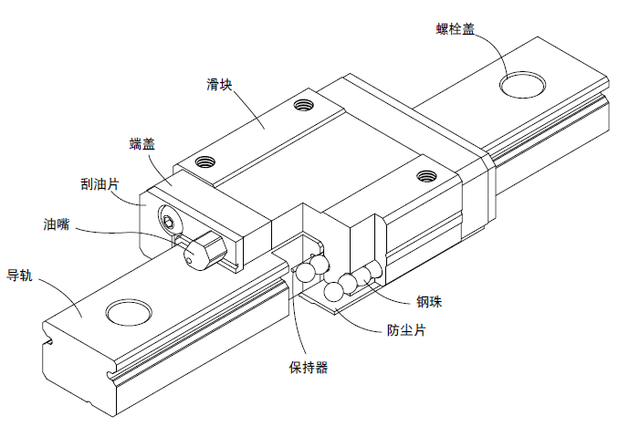 滾動循環(huán)系統(tǒng):滑塊、導(dǎo)軌、端蓋、鋼珠、保持器