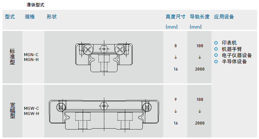 HIWIN提供標(biāo)準(zhǔn)型及寬幅型兩種直線導(dǎo)軌,方便客戶選型使用。