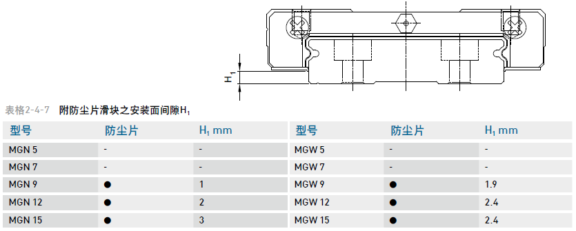 標(biāo)準(zhǔn)防塵配備滑塊兩端裝有刮油片,以阻隔粉塵或雜質(zhì)進(jìn)入滑塊內(nèi)部,而影響直線導(dǎo)軌壽命及精度。防塵片是裝在滑塊底部,以防止粉塵或雜質(zhì)從滑塊底部間隙進(jìn)入滑塊內(nèi)部,客戶若欲選用防塵片,可于型號(hào)后面加 +U 代碼。規(guī)格5、7滑塊至底部承靠面間隙 (H1) 很小,并不提供加裝防塵片,然規(guī)格9、12與15有提供防塵片選用??蛻粼谶x用防塵片時(shí),需注意滑塊間隙 (H1) 變小,當(dāng)有側(cè)邊承靠面使用時(shí),側(cè)邊承靠面之高度,不可大于間隙值(H1),以避免滑塊在運(yùn)行時(shí)干涉到側(cè)邊承靠面。
