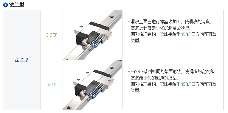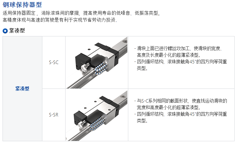 S系列使用四列鋼珠承受負(fù)荷設(shè)計(jì),使其具備高剛性、高負(fù)荷的特性,同時(shí)具備四方向等負(fù)載特色、及自動(dòng)調(diào)心的功能, 可吸收安裝面的裝配誤差,得到高精度的訴求。 加上降低組合高度及縮短滑塊長(zhǎng)度,非常適合高速自動(dòng)化產(chǎn)業(yè)機(jī)械及空間要求的小型設(shè)備使用。